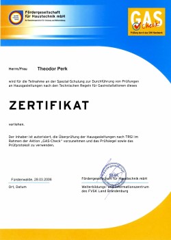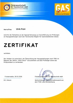 Zertifizierung als Fachbetrieb „Gas-Check“, Überprüfung von Heizungsanlagen nach TRGI